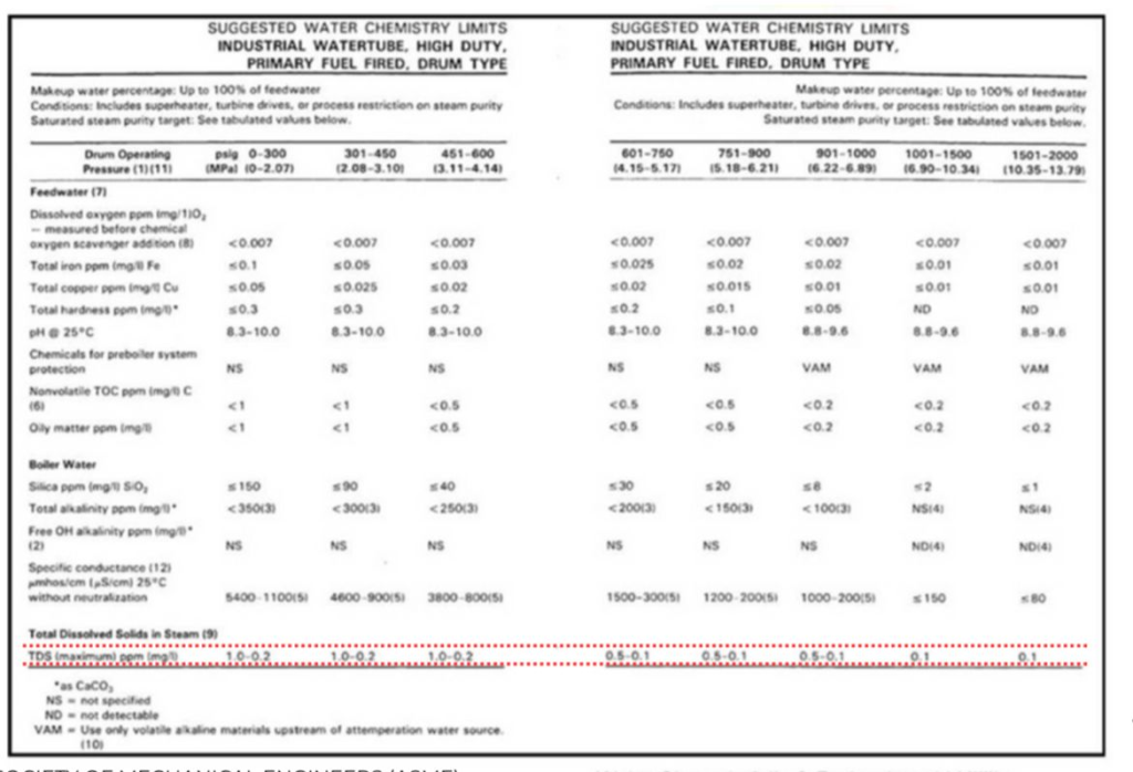 Menurut ASME Consensus of Operating Practices for The Control of  Feed Water and Boiler Water Chemistry air umpan boiler harus memiliki mineral terlarut maksimal 0,1 ppm pada tekanan 2000 psig atau sekitar 136 atm. Pada tekanan lebih dari 136 atm, maka jumlah mineral terlarut yang terkandung dalam air semakin sedikit untuk menghindari terjadinya partikel padat yang terbawa oleh uap.